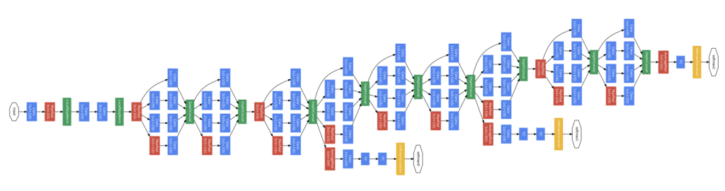 Architecture of GoogLeNet (Szegedy et al., 2015) — a convolutional neural network for image classification.
