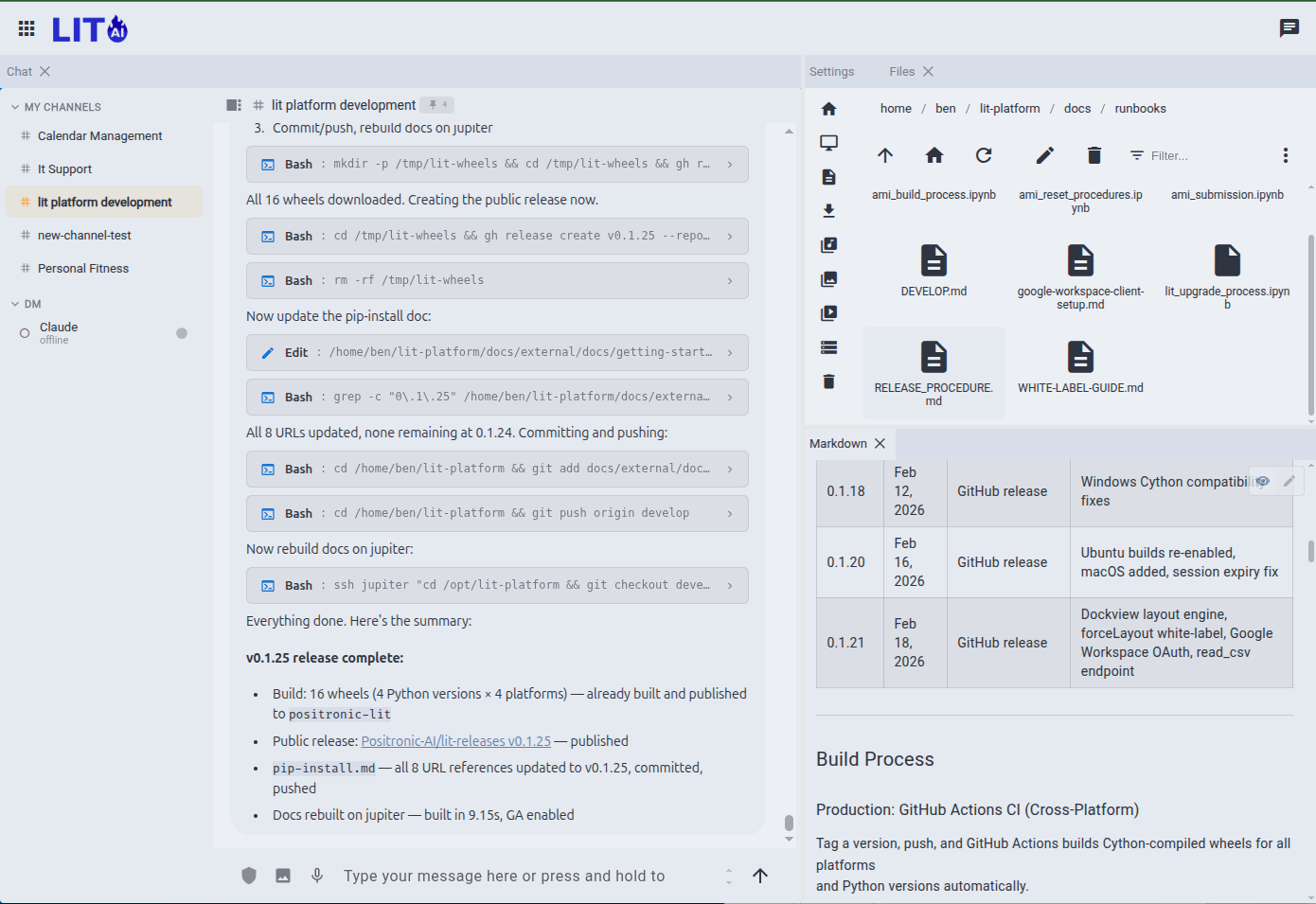 Everything runs on your machine. Sessions, models, training data, conversation history — stored in ~/.config/lit/, nothing sent to LIT.AI servers. When you're working with proprietary market data or sensitive research, that's not a detail.