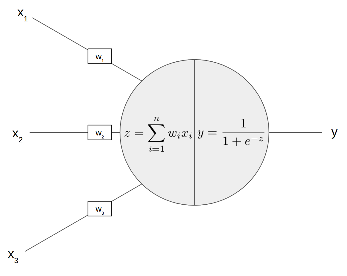 A single artificial neuron is almost comically simple. It takes in several numbers, multiplies each one by a stored weight, adds them all up, and passes the result through a simple function. That's the whole thing.