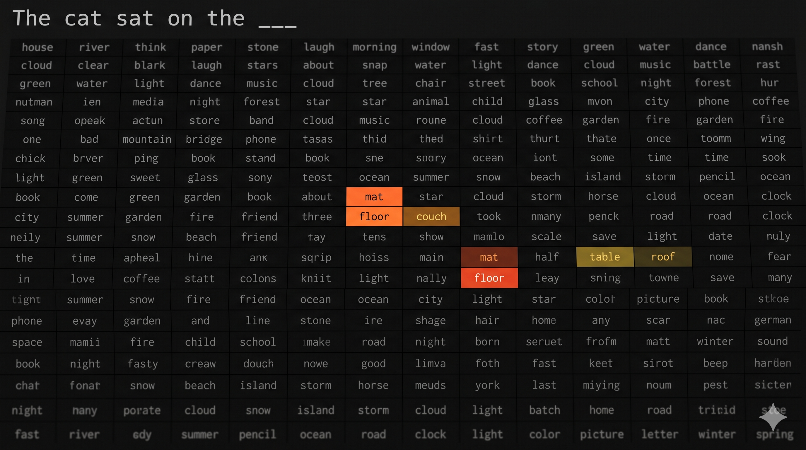 Given "The cat sat on the ___", the model assigns high probability to words like "mat," "floor," "couch" and very low probability to words like "algorithm" or "bankruptcy." It picks one — stochastically, with controlled randomness — appends it, and repeats. Word by word, a response emerges.
